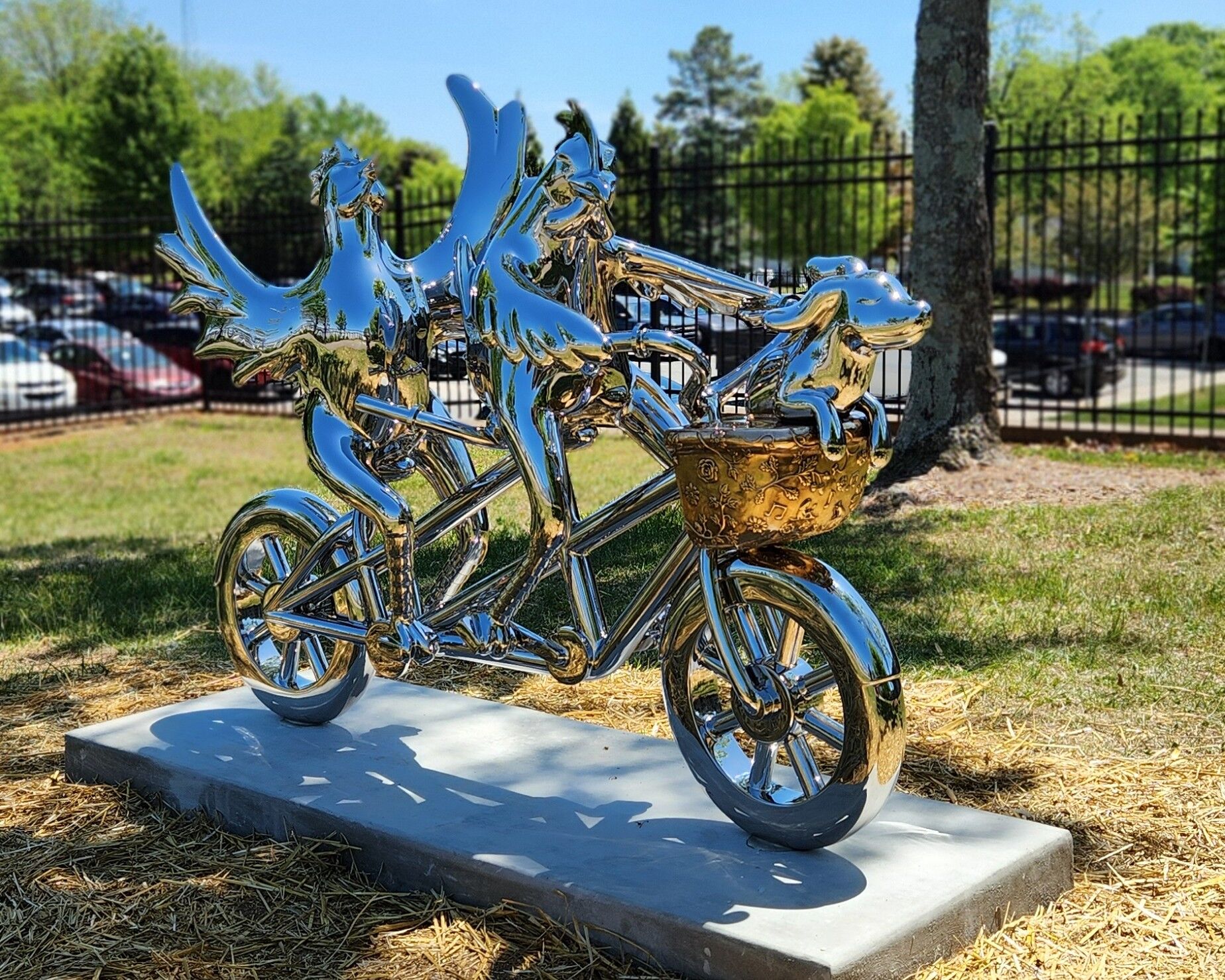 The sculpture features a whimsical tandem bicycle carrying two chickens and a puppy – a playful yet meaningful representation inspired by Sanders’ life. The imagery celebrates curiosity, connection, and the joy of everyday experiences. The puppy, with ears flapping in motion, represents loyalty and play, while the chickens reflect grounded, simple joys often found close to home. Together, they echo the experience of the Downtown Greenway itself – a place where movement, connection, and discovery happen every day.